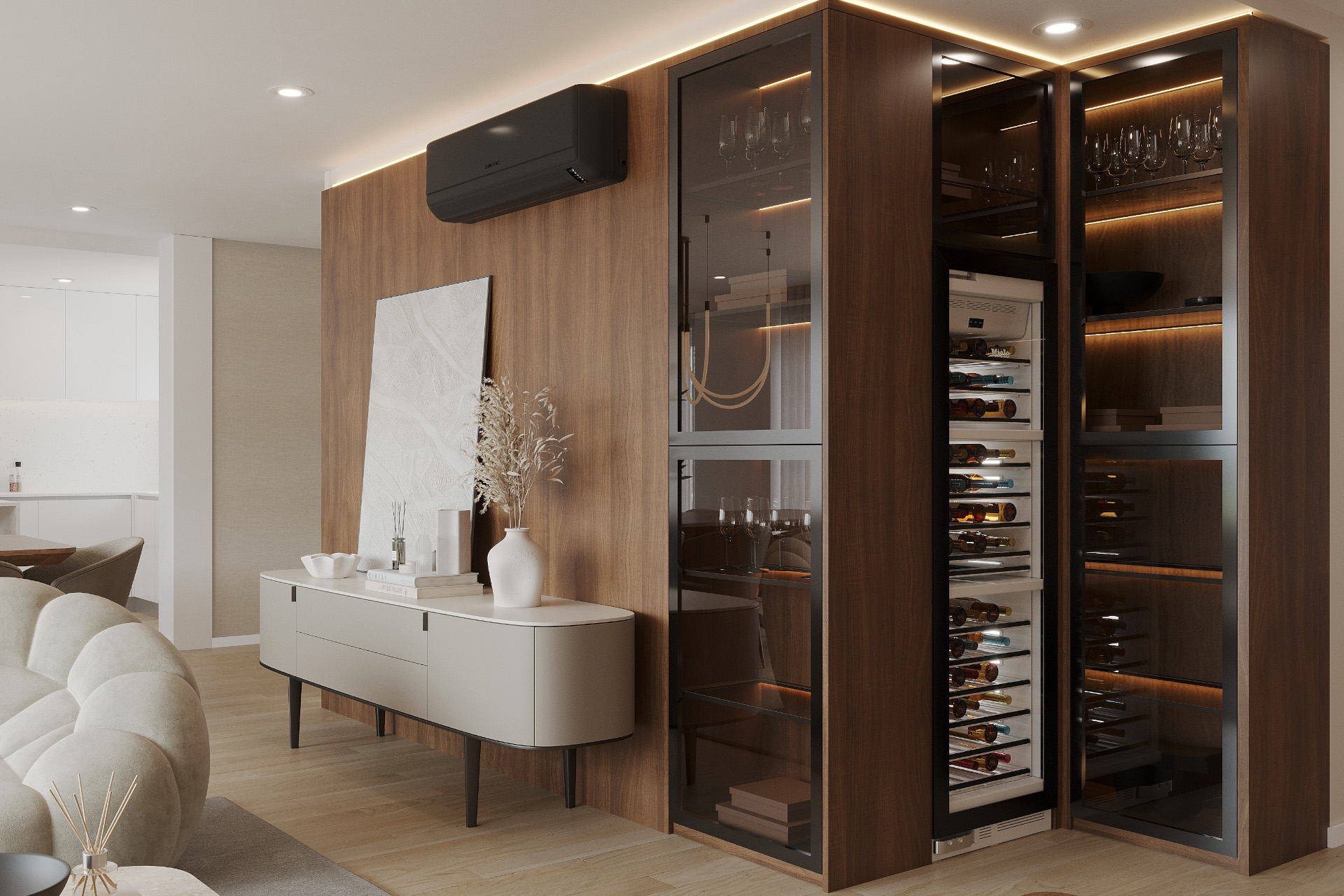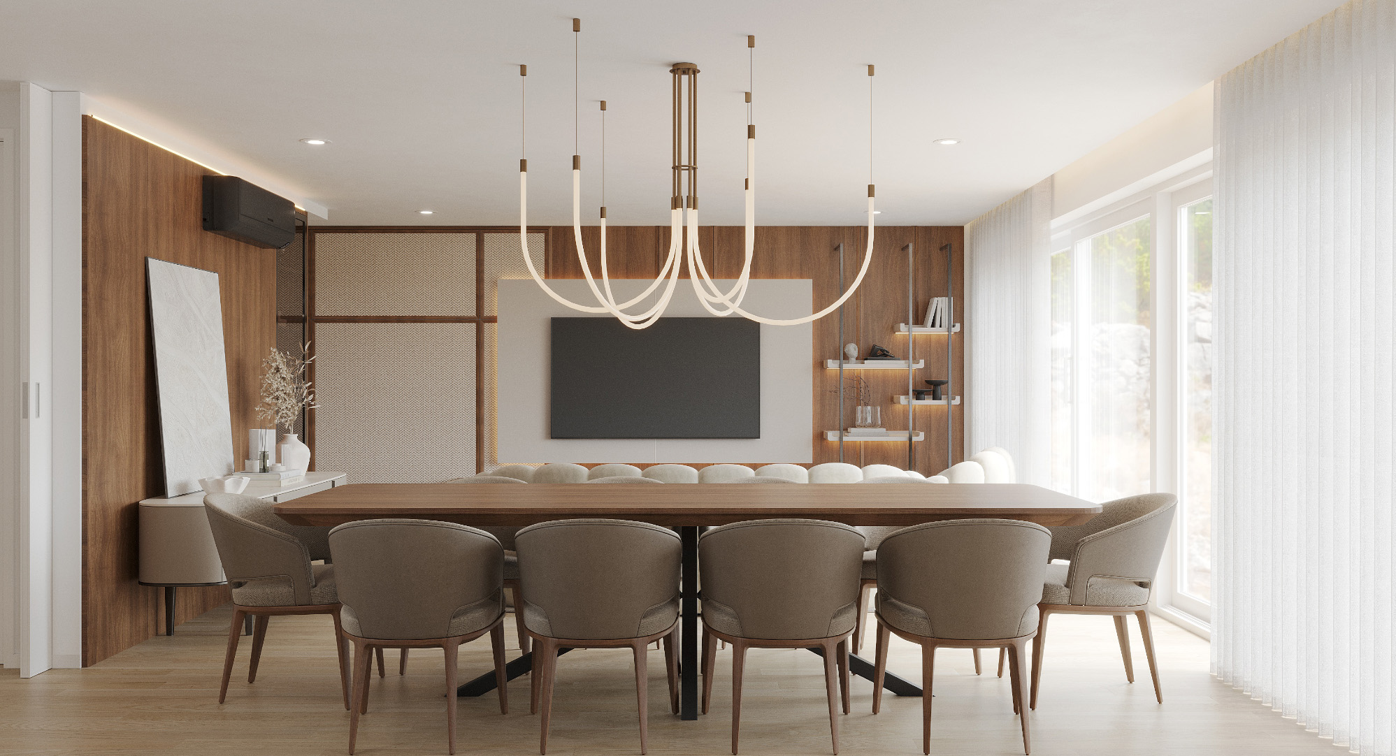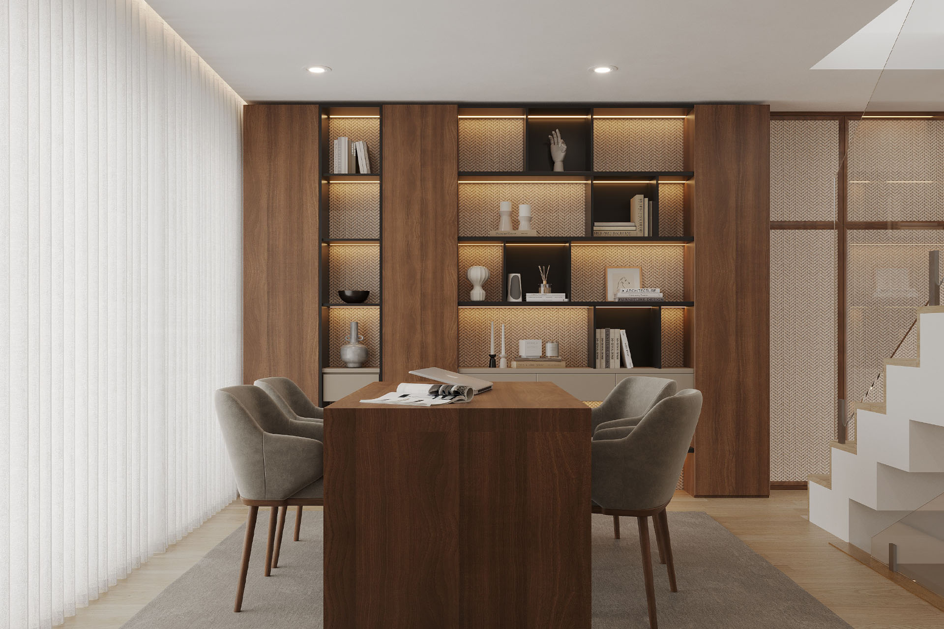 Este projeto destaca a perfeita integração entre a sala de jantar e a cozinha, resultando num ambiente acolhedor e funcional. O armário adega iluminado, que combina madeira nobre e vidro, adiciona um toque de sofisticação, tornando-se um espaço ideal para convívio. No escritório, a mesa robusta harmoniza com as cadeiras estofadas, garantem um equilíbrio entre elegância e conforto.